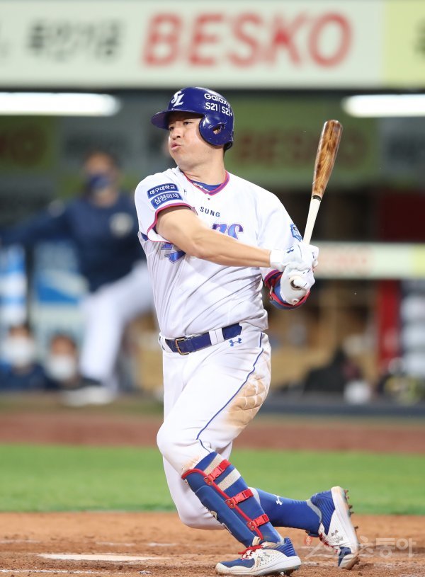 2회초 선두타자로 나선 강민호는 볼카운트 3B-2S서 오원석의 8구째 시속 130㎞ 슬라이더를 완벽하게 잡아당겨 좌측 관중석 상단에 꽃히는 큼지막한 솔로홈런을 터트렸다.
