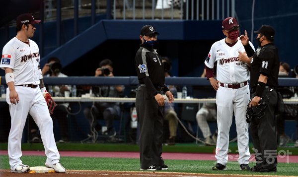 4회초 무사 1, 2루에서 롯데 마차도 내야 땅볼을 때린 후 1루에서 아웃되자 키움 홍원기 감독이 마차도가 파울라인 안으로 달렸다며 심판에게 항의하고 있다.