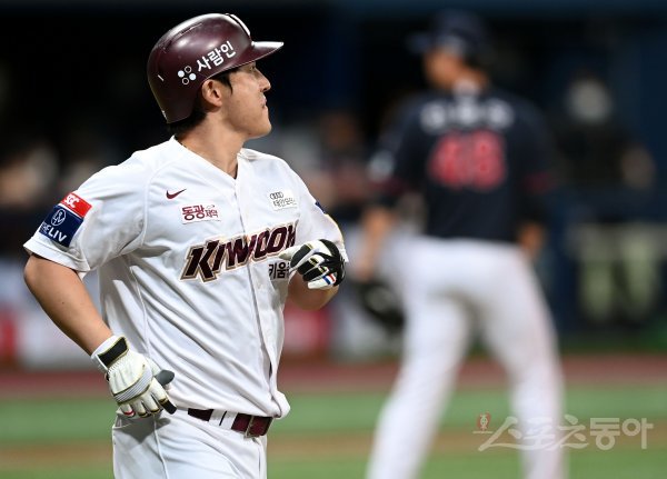 7회말 2사 만루에서 키움 박동원이 밀어내기 볼넷으로 출루하고 있다.