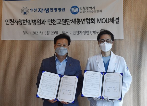 인천자생한방병원(병원장 우인)과 인천교원단체총연합회(이하 인천교총)는 29일 지역민의 의료복지 증진을 위한 업무협약을 맺었다.이날 인천자생한방병원 회의실에서 열린 업무협약식에는 인천자생한방병원 우인 병원장과 인천교총 이대형 회장을 포함한 양 기관 주요 인사들이 참석했다.
