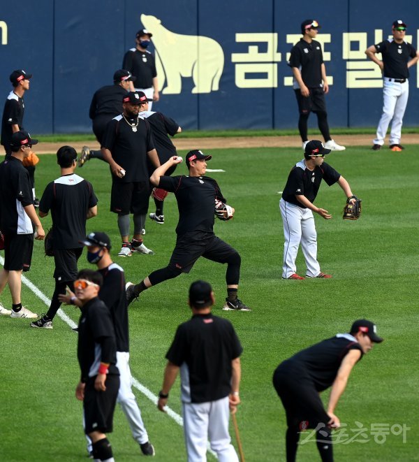 경기 전 kt 선수들이 외야에서 훈련을 하고 있다.
