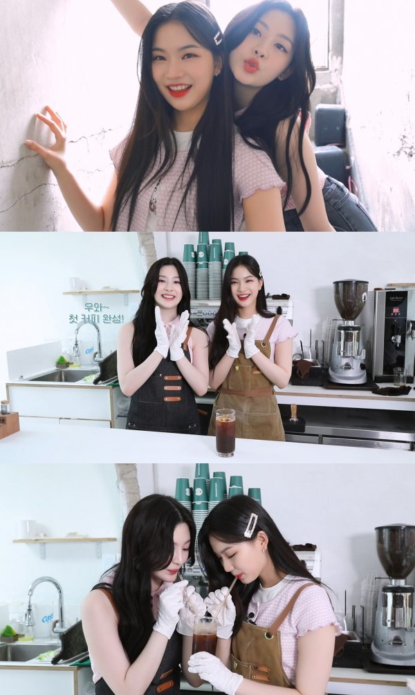 그룹 스테이씨(STAYC) 멤버 아이사와 세은이 커피 만들기에 도전하며 러블리한 케미를 선보였다.