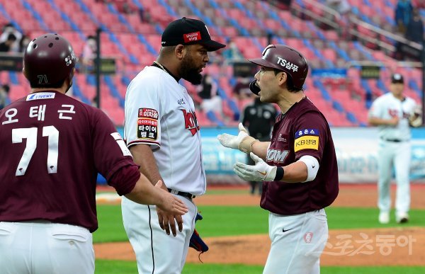 3회초 2사 1, 2루에서 키움 이용규가 내야땅볼로 아웃 된 후 kt 선발 데스파이네와 신경전을 벌이고 있다.