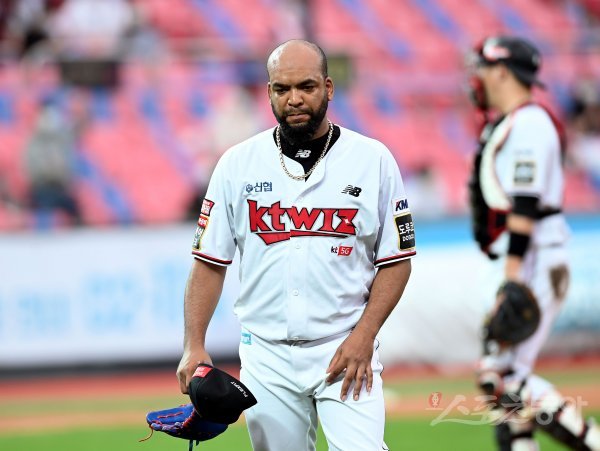 5회초 1사 1, 3루에서 3점 홈런을 허용한 kt 선발 데스파이네가 교체되고 있다.