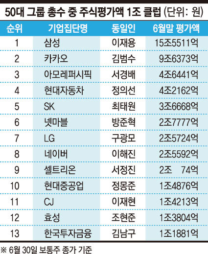 50대 그룹 총수 중 6월 말 기준 주식재산 1조 클럽에 가입한 인원은 13명으로 집계됐다. 1월초 11명, 3월말 12명보다 더 늘어난 수치다. 6월말 기준 그룹 총수 주식재산 1위는 15조5511억 원을 기록한 이재용 삼성 부회장이었다. 김범수 카카오 의장이 9조6373억 원으로 2위에 올랐다.