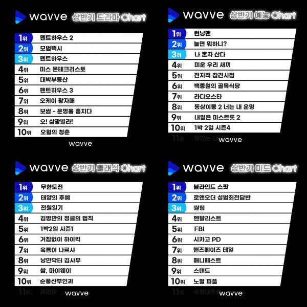 온라인 동영상 서비스 웨이브가 올해 상반기 결산 시청 순위를 발표했다. 더불어 장르별 최고 콘텐츠를 모아볼 수 있는 특집관을 열었다.
