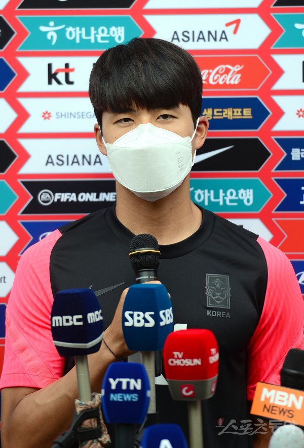 훈련 전 설영우가 인터뷰를 하고 있다.