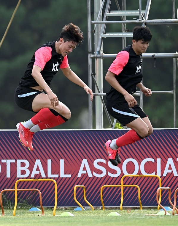 도쿄올림픽 축구대표팀이 6일 경기도 파주 국가대표트레이닝센터(NFC)에서 훈련을 가졌다. 황의조와 김민재가 훈련을 하고 있다.
