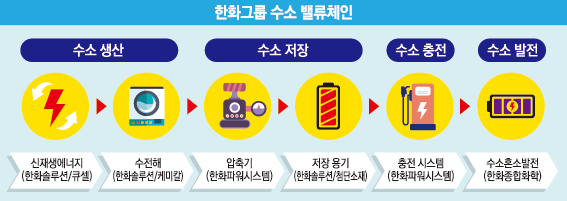 한화그룹은 이미 그린수소 생산에서 공급에 이르는 전 주기에 걸친 수소 사업 역량을 키워가고 있다. 신재생에너지를 활용한 수소 생산은 한화솔루션과 한화 큐셀이, 수소저장은 한화파워시스템과 한화솔루션 첨단소재 부문이, 수소혼소발전은 한화종합화학이 담당하며 수소 사업 역량을 확대해나가고 있다.
