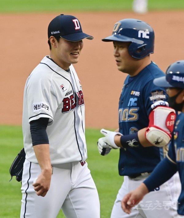 1회초 수비를 마친 뒤 두산 최원준이 웃으며 더그아웃으로 향하고 있다.