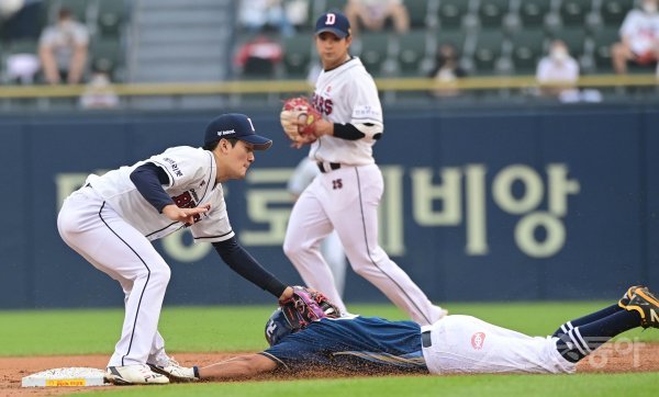 2회초 2사 1루 상황에서 두산 유격수 안재석이 도루를 시도하는 NC의 1루주자를 태그 아웃시키고 있다.