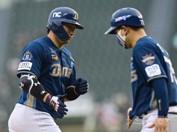 3회초 2사 NC 나성범이 연타석 솔로 홈런을 쳐낸 뒤 3루코치와 기쁨을 나누고 있다.