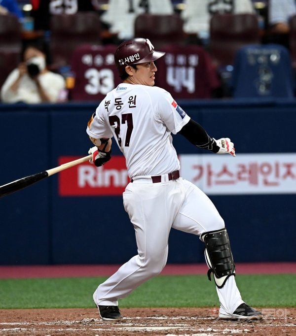 4회말 1사 1, 3루에서 키움 박동원이 1타점 적시타를 날리고 있다.