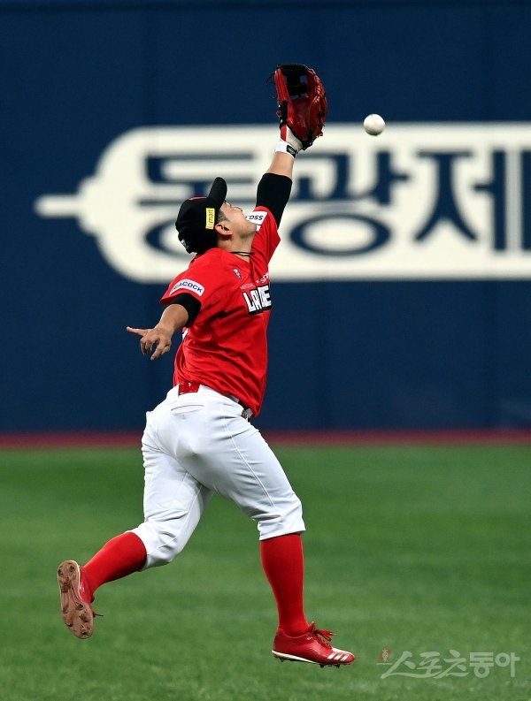 7회말 무사에서 SSG 최주환이 타구를 잡으려고 점프했으나 볼은 키를 넘어가고 있다.