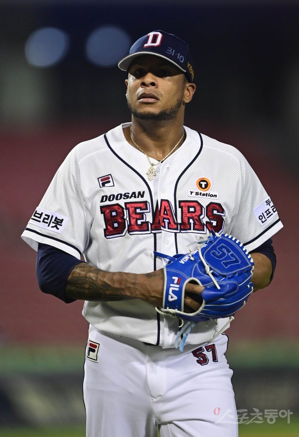 8회초 수비를 마친 뒤 두산 미란다가 더그아웃으로 들어오고 있다.