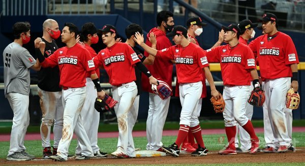 SSG가 키움을 상대로 9-3 역전승을 거둔 뒤 선수들이 그라운드에서 기쁨을 나누고 있다.