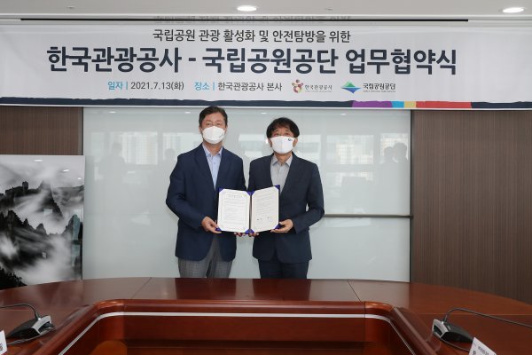 한국관광공사(사장 안영배)는 13일 국립공원공단(이사장 송형근)과 ‘국립공원 관광활성화 및 안전 탐방을 위한 업무협약’을 체결했다.