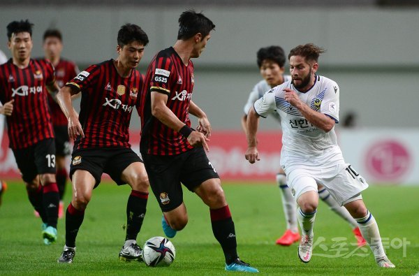 14일 서울월드컵경기장에서 열린 ‘하나원큐 K리그1 2021’ FC 서울과 인천 유나이티드의 경기에서 인천 아길라르가 서울의 수비를 뚫고 드리블 돌파하고 있다.