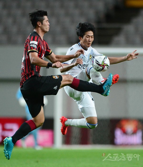 14일 서울월드컵경기장에서 열린 ‘하나원큐 K리그1 2021’ FC 서울과 인천 유나이티드의 경기에서 서울 홍준호와 인천 박창환이 볼을 향해 발을 뻗고 있다.