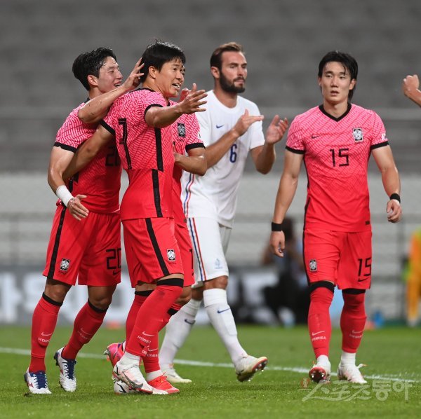 16일 서울월드컵경기장에서 열린 올림픽 축구대표팀과 프랑스의 평가전에서 한국 권창훈이 선제 패널티킥을 성공시킨 후 동료득과 기뻐하고 있다.
