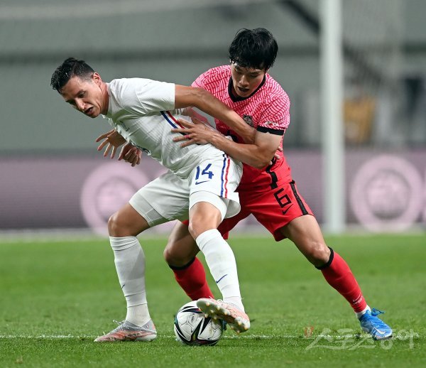16일 서울월드컵경기장에서 열린 올림픽 축구대표팀과 프랑스의 평가전에서 한국 강윤성과 프랑스 토뱅이 볼다툼을 하고 있다다.