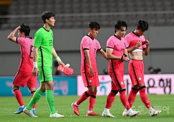 16일 서울월드컵경기장에서 열린 하나은행 초청 2020 도쿄올림픽 축구대표팀 평가전 한국과 프랑스의 경기에서 한국이 프랑스에 1-2로 패한 뒤 선수들이 아쉬워하고 있다.