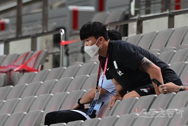 16일 서울월드컵경기장에서 열린 하나은행 초청 2020 도쿄올림픽 축구대표팀 평가전 한국과 프랑스의 경기에서 김민재가 관중석에서 경기를 지켜보고 있다.