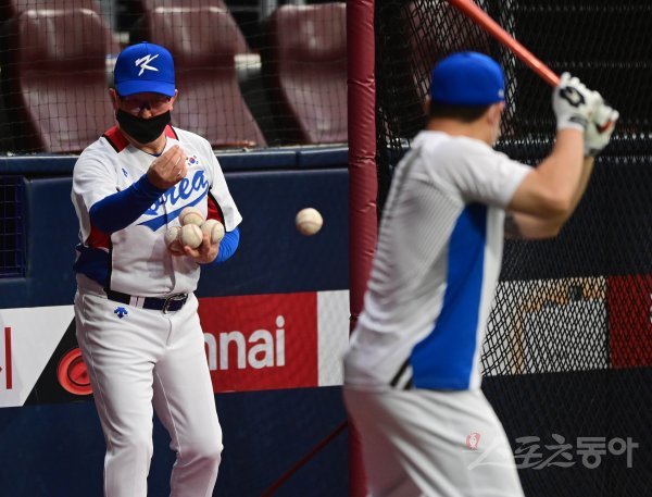 18일 서울 고척스카이돔에서 열린 2020 도쿄올림픽 한국 야구대표팀의 훈련에서 김경문 감독이 선수들의 타격 훈련을 돕고 있다.