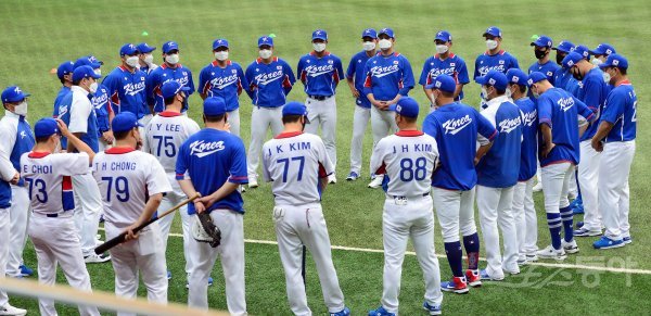 18일 서울 고척 스카이돔에서 ‘2020 도쿄올림픽’ 야구대표팀의 공식훈련이 진행됐다. 야구대표팀 선수들이 훈련에 앞서 미팅을 하고 있다.