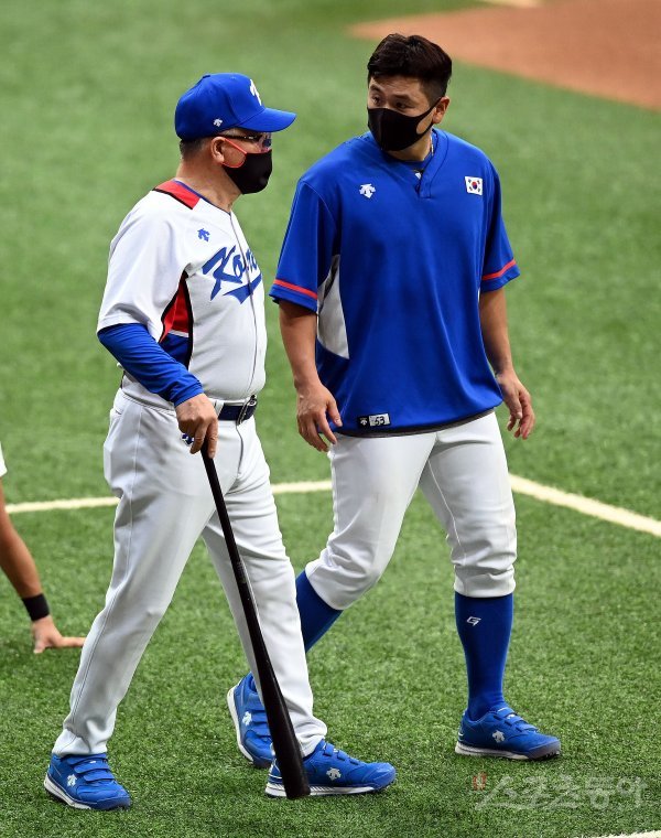 18일 서울 고척 스카이돔에서 ‘2020 도쿄올림픽’ 야구대표팀의 공식훈련이 진행됐다. 야구대표팀 김경문 감독이 최주환이 이야기를 나누고 있다.