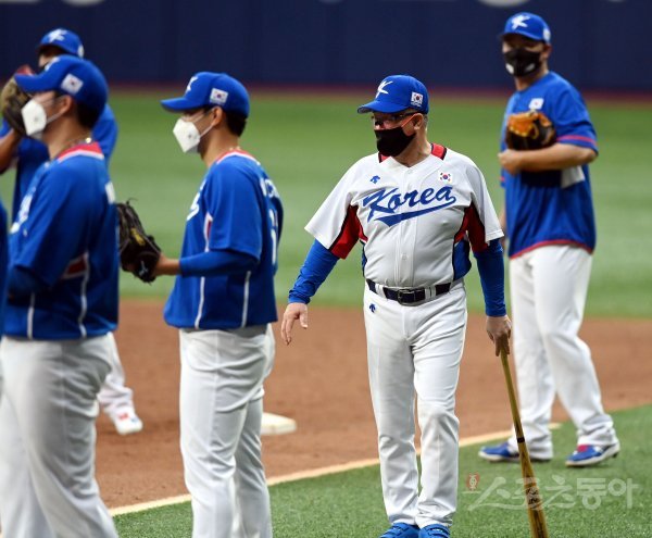 18일 서울 고척 스카이돔에서 ‘2020 도쿄올림픽’ 야구대표팀의 공식훈련이 진행됐다. 야구대표팀 김경문 감독이 선수들의 훈련을 지켜보고 있다.
