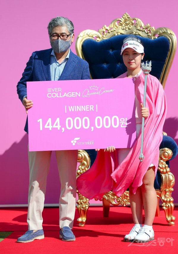 18일 경기도 양주 레이크우드CC에서 열린 KLPGA투어 ‘에버콜라겐 퀸즈 크라운 2021’ 최종라운드에서 연장 접전 끝에 우승을 차지한 전예성이 김도언 뉴트리 회장과 포토타임을 갖고 있다.