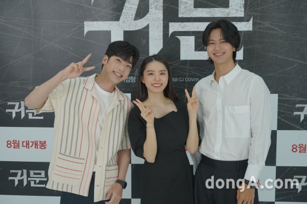 배우 홍진기, 김소혜, 이정형(왼쪽부터)이 19일 오전 11시 영화 ‘귀문’ 온라인 제작발표회에 참석해 포즈를 취하고 있다.