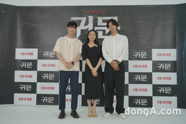 배우 홍진기, 김소혜, 이정형(왼쪽부터)이 19일 오전 11시 영화 ‘귀문’ 온라인 제작발표회에 참석해 포즈를 취하고 있다.