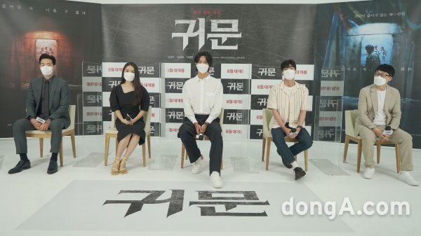배우 김강우, 김소혜, 이정형, 홍진기, 심덕근 감독(왼쪽부터)이 19일 오전 11시 영화 ‘귀문’ 온라인 제작발표회에 참석해 취재진의 질문에 답변하고 있다.