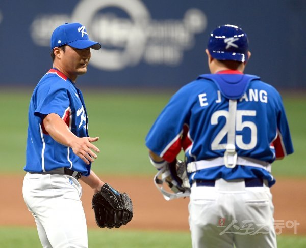 9회말 교체 등판한 대표팀 오승환이 승리를 확정지은 후 하이파이브 하고 있다.