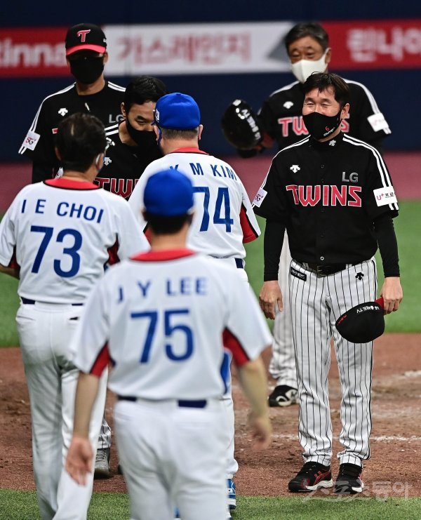 24일 서울 고척스카이돔에서 열린 ‘신한은행 SOL 야구 국가대표팀 평가전’ 한국과 LG 트윈스의 경기에서 한국대표팀과 LG가 2-2로 무승부로 경기를 마친 뒤 류지현 감독이 한국대표팀 코치진을 향해 인사하고 있다.