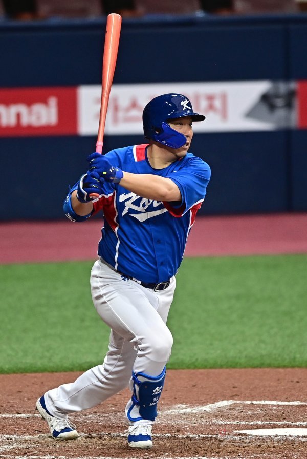 25일 서울 고척스카이돔에서 열린 ‘신한은행 SOL 야구 국가대표팀 평가전’ 한국과 키움 히어로즈의 경기에서 5회초 1사 1, 2루 한국대표팀 김현수가 선제 1타점 우전 적시타를 치고 있다.