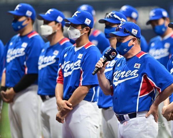 25일 서울 고척스카이돔에서 열린 ‘신한은행 SOL 야구 국가대표팀 평가전’ 한국과 키움 히어로즈의 경기에서 한국대표팀이 키움에 2-1로 승리를 거둔 뒤 출정식에서 김경문 감독이 인터뷰를 하고 있다.