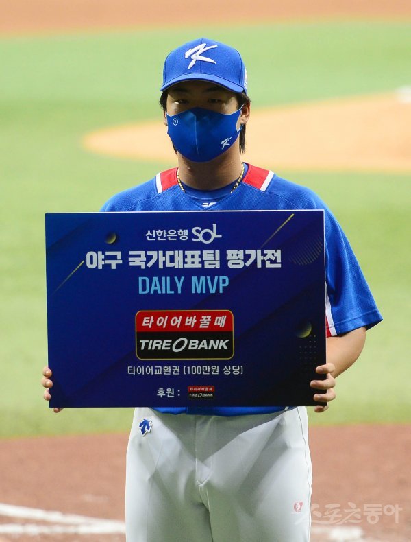 25일 서울 고척스카이돔에서 열린 ‘신한은행 SOL 야구 국가대표팀 평가전’ 한국과 키움 히어로즈의 경기에서 한국대표팀이 키움에 2-1로 승리를 거둔 뒤 강백호가 데일리 MVP를 수상하고 있다.