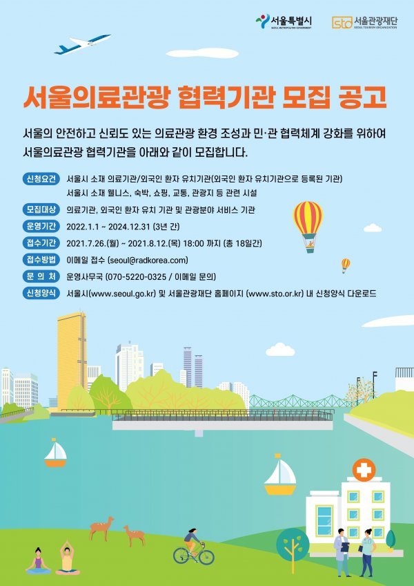 서울시와 서울관광재단(대표이사 길기연)은 지속가능한 의료관광을 함께 만들어나갈 협력기관을 모집한다. 모집분야는 의료기관, 외국인환자 유치기관, 관광분야 서비스기관이며, 모집기간은 8월12일까지이다. 웰니스 기관 추가, 협력기관 수 200여개 확대