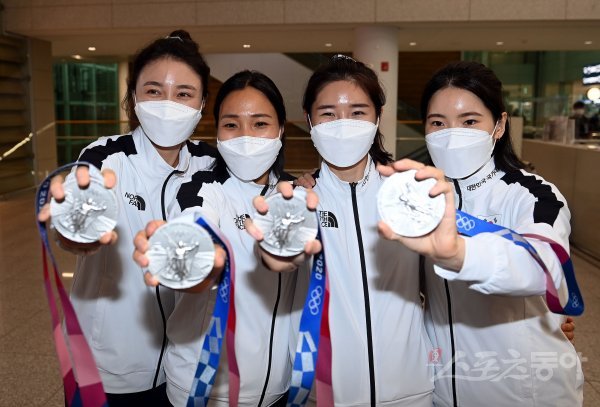 ‘2020 도쿄올림픽’ 여자 펜싱 에페 단체전 은메달을 획득한 최인정, 강영미, 이혜인, 송세라가 28일 인천국제공항을 통해 귀국해 카메라를 향해 포즈를 취하고 있다.