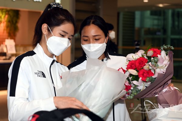‘2020 도쿄올림픽’ 여자 펜싱 에뻬 단체전 은메달을 획득한 이혜인이 강영미와 28일 인천국제공항을 통해 귀국해 이야기를 나누고 있다.