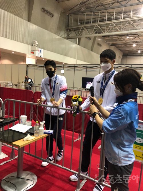28일 지바 마쿠하리멧세홀B에서 열린 펜싱 남자 사브르 단체전에서 금메달을 딴 오상욱의 인터뷰 때 자원봉사자가 마이크를 들어주고 있다. 도쿄 | 강산 기자