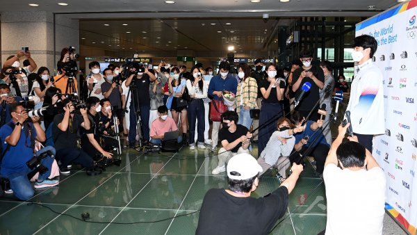 ‘2020 도쿄올림픽’ 수영대표팀 황선우가 1일 인천국제공항을 통해 귀국해 인터뷰를 하고 있다.