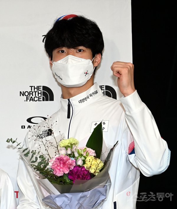 ‘2020 도쿄올림픽’ 수영대표팀 황선우가 1일 인천국제공항을 통해 귀국해 카메라를 향해 포즈를 취하고 있다.