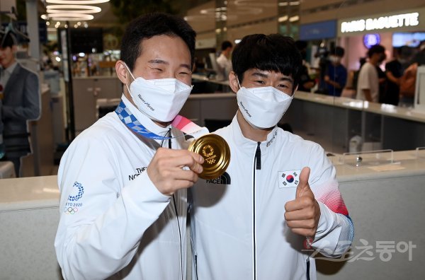 ‘2020 도쿄올림픽’ 체조대표팀 신재환이 양학선과 함께 3일 인천국제공항을 통해 귀국해 기념촬영을 하고 있다.