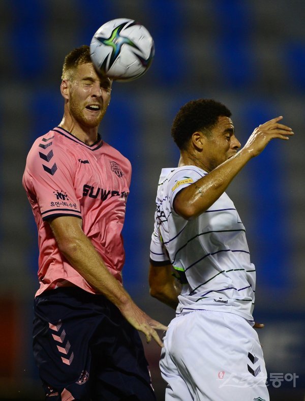 4일 수원종합경기장에서 열린 ‘하나원큐 K리그1 2021’ 수원 FC와 전북 현대의 경기에서 수원 FC 잭슨이 전북 구스타보 앞에서 헤딩을 하고 있다.