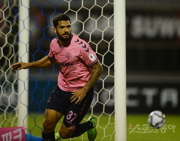 4일 수원종합경기장에서 열린 ‘하나원큐 K리그1 2021’ 수원 FC와 전북 현대의 경기에서 수원 FC 타르델 리가 선제골을 성공시킨 뒤 세리머니를 하고 있다.