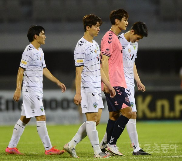4일 수원종합경기장에서 열린 ‘하나원큐 K리그1 2021’ 수원 FC와 전북 현대의 경기에서 전북이 수원 FC에 0-1로 패한 뒤 아쉬워하고 있다.